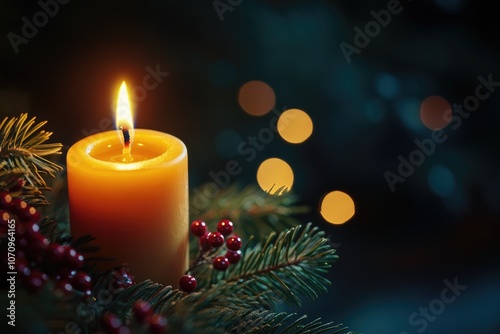 A Lit Candle Surrounded by Pine Sprigs and Red Berries