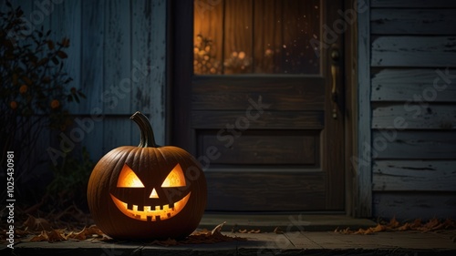A lit jack-o'-lantern sits on a porch in front of a wooden door, surrounded by fall leaves.