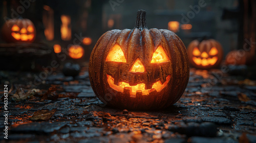 A lit jack-o'-lantern with a toothy grin sits on a dark, cobblestone path.