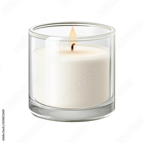 A lit white candle in a clear glass holder with a visible flame on a black isolated background view