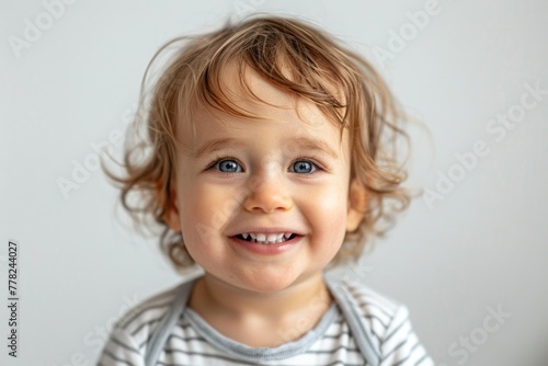 A little boy with curly hair smiling at the camera, isolated on white background.