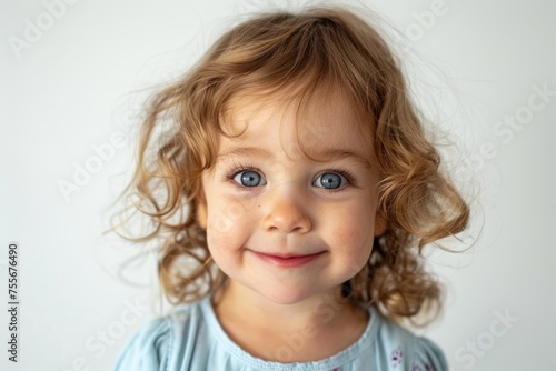 A little girl with curly hair and blue eyes