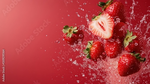 A lively assortment of strawberries surrounded by splashes of water, presenting a fresh and fun atmosphere, perfect for fruit-related ads and health promotions.