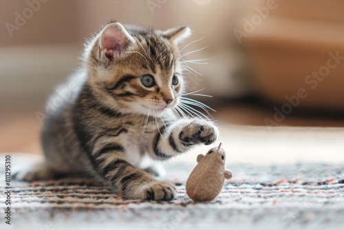 A lively kitten energetically plays with a shiny toy mouse on the floor, A playful kitten pawing at a shiny toy mouse