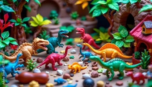 a lively scene of a group of dinosaurs frolicking in a forest setting