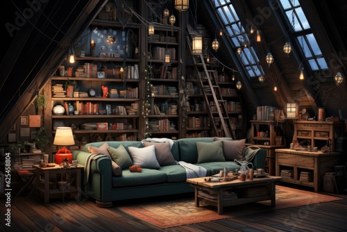 A living room filled with lots of books. Generative AI.