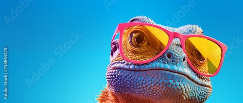 a lizard with sunglasses in blue space, in the style of vibrant color-blocking, 32k uhd, post-internet aesthetics, pink and amber, heatwave, vibrant colours