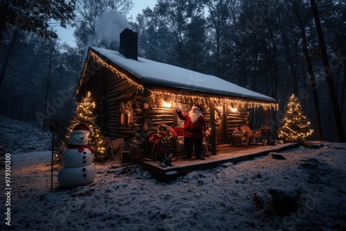 A log cabin decorated with bright Christmas lights and Santa Claus standing in front, surrounded by a snowy forest and twinkling lights setting a magical atmosphere.