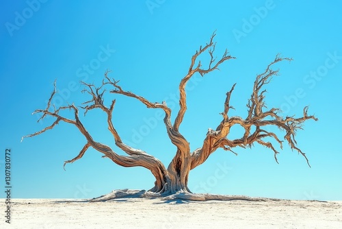 A lone, ancient, dead tree stands stark against a vibrant blue sky in a desolate, sandy landscape.