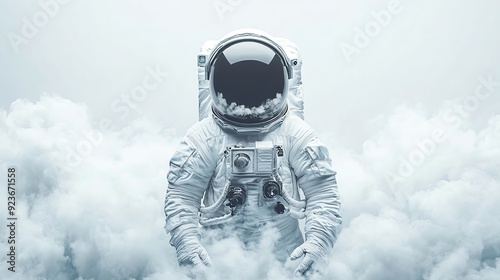 A lone astronaut in a white spacesuit, surrounded by clouds, creating a surreal, dreamlike atmosphere. Ideal for space and exploration themes.