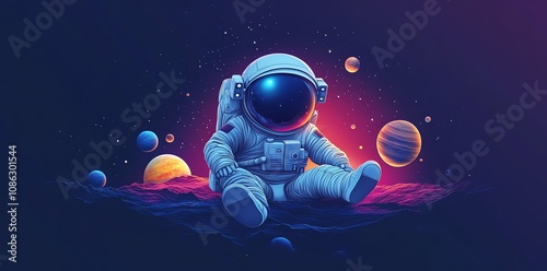 A lone astronaut sits on a colorful planet surface, surrounded by planets and stars.
