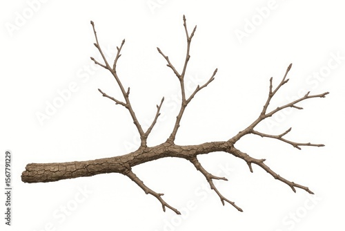 A lone dry tree branch with cracked bark and aged surface against a white background