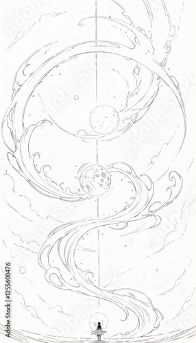 A lone figure, cloaked and small, stands before a celestial vortex swirling between two moons, the scene imbued with a sense of wonder and quiet contemplation. Line art, whimsical fantasy illustration
