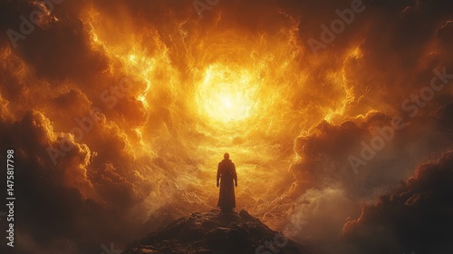 A lone figure stands atop a mountain, facing a fiery celestial phenomenon