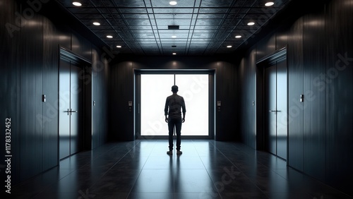 A lone figure stands before a grand, open doorway, his back to the viewer as he gazes out into the unknown, against a stark backdrop of black tile flooring and a grid-patterned ceiling