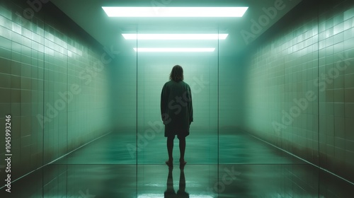 A lone figure stands in a futuristic, sci-fi inspired hallway filled with an eerie green glow, inviting thoughts of solitude and introspection amidst silence.