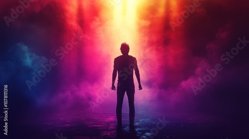 A lone figure stands in a smoky, colorful environment, illuminated by a bright light.