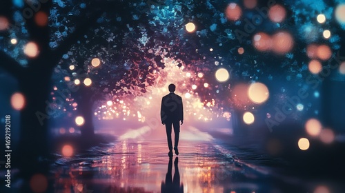 A lone figure walks down a mysterious pathway at night, illuminated by warm lights.