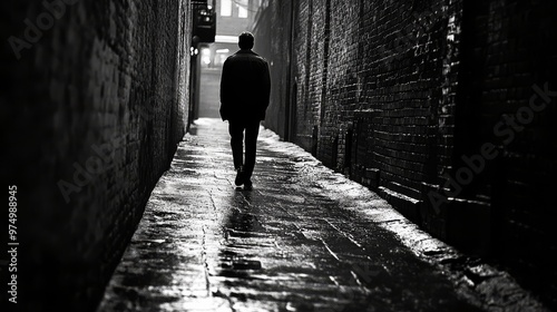A lone individual walks through a dimly lit alley illuminated by fading light and rain