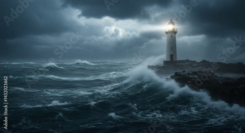 A lone lighthouse bravely stands against a violent storm with powerful ocean waves.