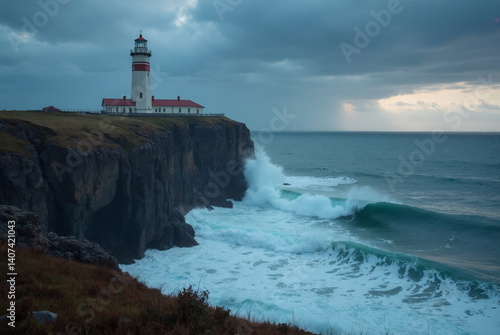 A lone lighthouse on a rugged coastline, with crashing waves and dramatic stormy skies.
