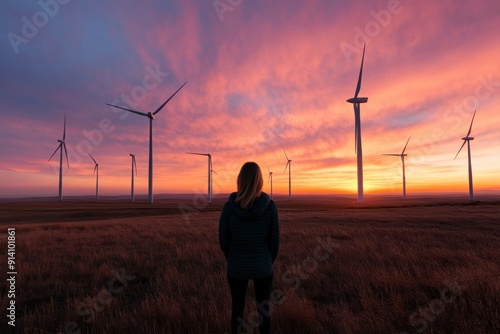 A lone person stands in a field, silhouetted against the backdrop of a stunning sunset and several wind turbines, epitomizing the harmony between humanity and renewable energy sources.