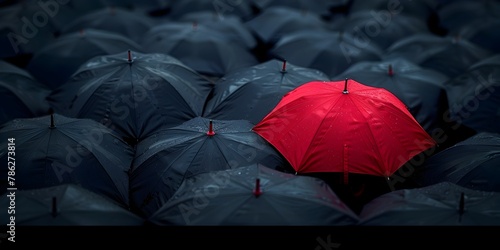 A Lone Red Umbrella in a Sea of Black Ones Symbolizing Courage to Stand Out and Lead in a Conforming Crowd