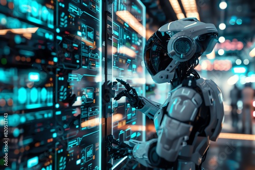 A lone robot works diligently to maintain a vast network of servers, ensuring the smooth operation of critical systems.