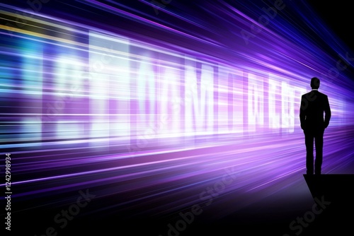 A lone soul is positioned in a futuristic urban setting with neon lights reflecting off the wet ground, invoking cyberpunk themes