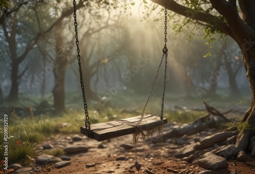A lone swing hangs from a broken chain, its chains covered in cobwebs and dust , forgotten, broken