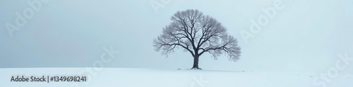 A lone tree dominates the snowy expanse, its limbs etched in frosty silence, trunk, winter, branch