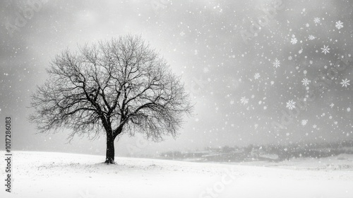 A lone tree in a vast snow-covered landscape, its branches dusted with snowflakes, evoking a sense of tranquility and winter wonder.