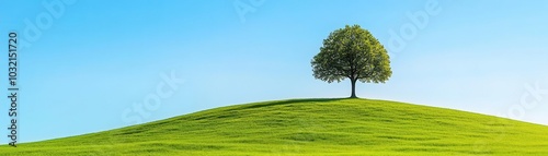 A lone tree on a grassy hill under a clear sky, simple landscape, natural tones, ultra-realistic, minimalist and balanced composition
