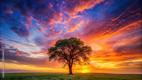 A lone tree stands tall against the vibrant orange and pink hues of a breathtaking sunset, tree, trees, peaceful