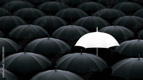 A lone white umbrella in a sea of identical black umbrellas slightly tilted as if resisting the storm The monochrome contrast enhances the idea of individuality and defiance High con