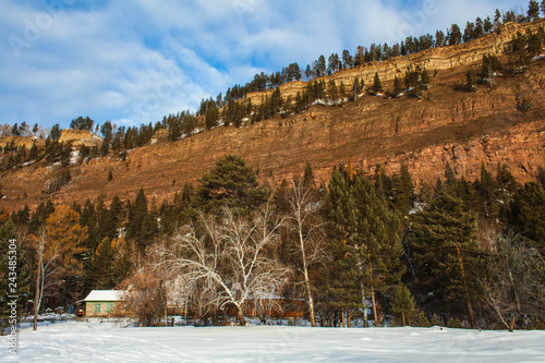 a lonely wooden siberian house at the bottom of a cliff