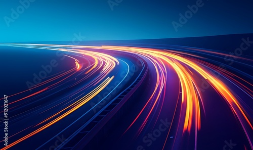 A long, curving road with many cars on it. The cars are moving fast and the road is lit with bright colors. The scene is energetic and exciting