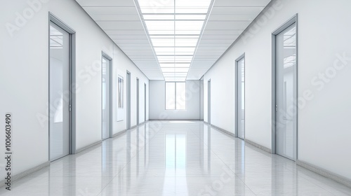 A long, empty hallway with white walls and a white ceiling, with a single window at the end of the hall.