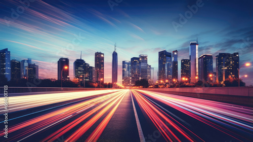 A long exposure shot of a cityscape at dusk, car lights and city life in motion