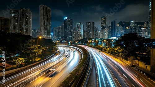 A long exposure shot of a highway with blurred traffic lights in front of a cityscape at night.