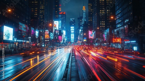 A long exposure shot of Times Square in New York City at night, with the bright lights of the billboards and traffic reflected in the wet streets.