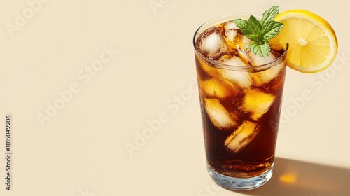 A Long Island iced tea cocktail with ice, a slice of lemon, and mint, styled against a soft beige background.