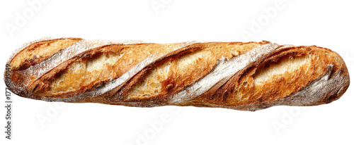 A long loaf of crusty bread with a golden-brown, slightly mottled exterior. The bread has a visible, decorative pattern of scored lines