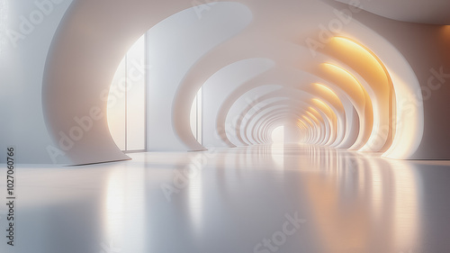 A long, narrow hallway with white walls and a white floor. The hallway is lit by a series of yellow lights