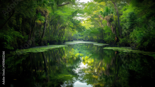 A long, narrow pond sits in the heart of a thick, untouched jungle.
