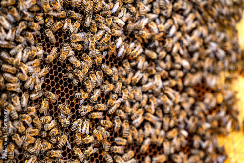 A lot of bees on frame. Special equipment for collecting honey. Selective focus.