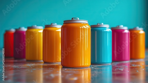 a low angle view of numerous spray paint cans against a light blue backgroun