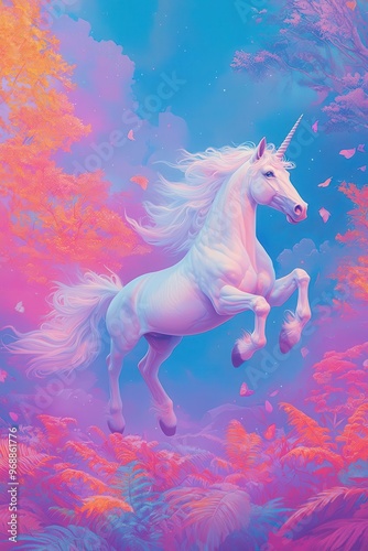 A low-angle view of a majestic unicorn gracefully trotting through a vibrant, surreal forest