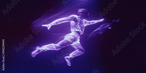 A low-resolution computer display of an abstract dancer floating in the dark, with a glitchy white and purple neon color palette.
