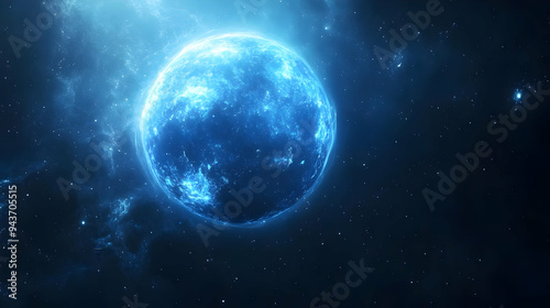 A luminous blue planet with a bright glow in a dark space filled with stars.